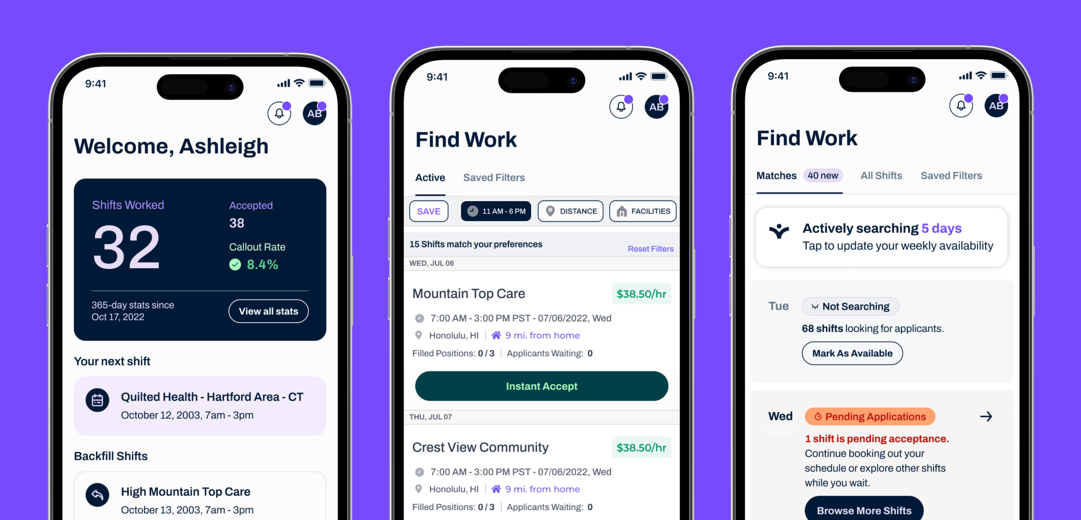 Discover the freedom of choosing when and where you work. Competitive same-day pay, opportunities across every care setting, and no mandatory minimums. Join 100,000+ nurses and CNAs who've already taken back their careers and their lives.